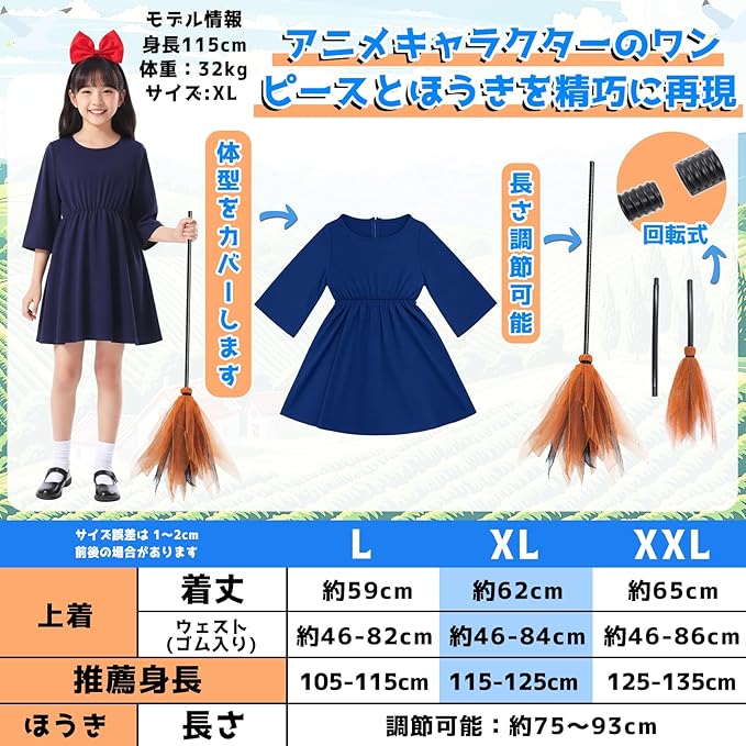 【豪華7点セットで子供のコスプレが即完成】人気魔女をモチーフにした子供用コスプレ衣装。ワンピース・魔法のほうき・バッグ・リボンカチューシャ・ハロウィンシール3枚の全アイテムがセットに。別途準備の手間がなく、届いた当日からハロウィン仮装や学園祭コスプレにお使いいただけます。女の子の魔女コスプレに最適なキッズ向け仮装セットです。サイズ:XXL