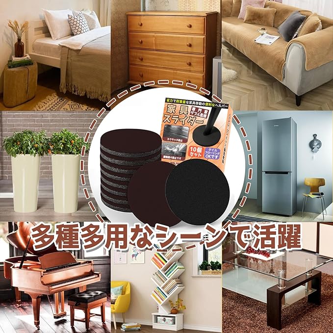 【商品スペック】素材:EVA+フェルト、内容量:10個セット、サイズ:直径約8.9㎝、厚さ約1.1㎝。家具移動 便利グッズ、優れた伸縮性により、気になる振動や音もしっかりと吸収します。