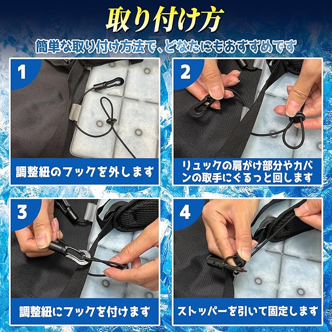 簡単な取り付け:リュック 背中 冷却パッド、留め具で4か所固定するだけで取り付けが完了します。アジャスター付きのゴムひもを使用し、肩ひもの幅に合わせて調節するだけで簡単に設置できます。リュック 冷感パッド リュック、リュックやランドセル、トートバッグなどさまざまなバッグに使用できます。