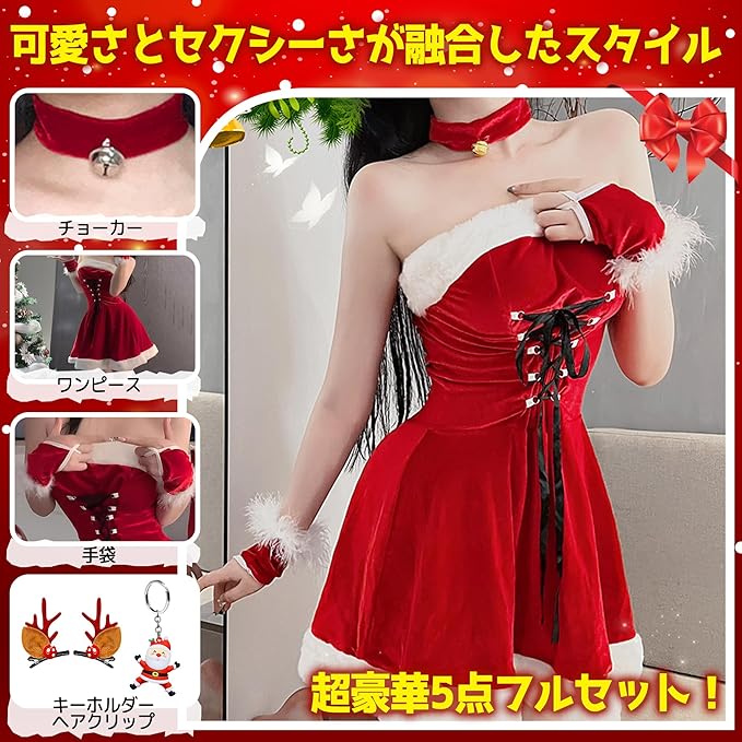 【サンタ コスプレ レディース豪華5点フルセット】 このは、完璧なクリスマスパーティーを演出するための必需品です。セット内容はワンピース、チョーカー、手袋、キーホルダー、ヘアクリップの5点で、あなたを魅力的なサンタガールに変身させます。クリスマスコスプレとして大人気のアイテムで、セクシーさと可愛さを兼ね備えています。特別なイベントで目を引くこと間違いなしです!