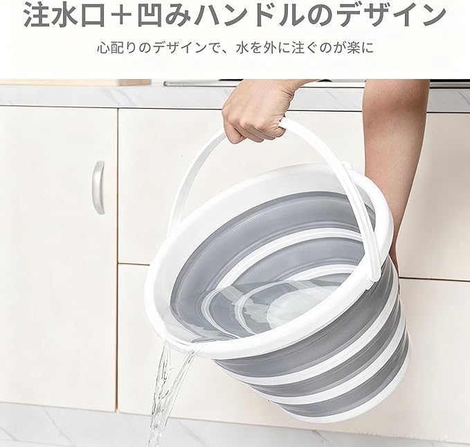 折りたたみバケツ 10L 大容量 厚手 丸型/四角型 多機能 洗濯 洗車 足湯 釣り コンパクト収納 PP+TPR素材 グレー/ホワイト (丸型)