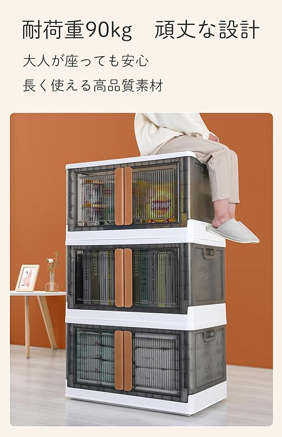 【耐荷重90kg・頑丈な設計】 高品質で厚みのある樹脂素材を採用し、変形しにくく長持ちします。大人が座っても安心の耐荷重90kgで、ちょっとした腰掛けとしても使用可能。変形しにくく長持ちするので、長期的に使える収納アイテムです。