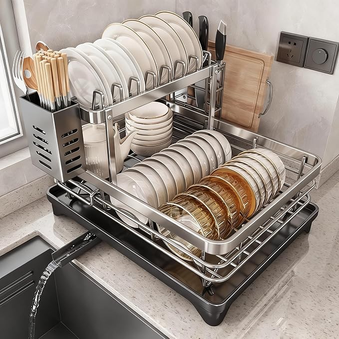 ステンレス製食器乾燥ラック, 2段式, カトラリー立て付き, グレー, 41 29 23cm (二段式)