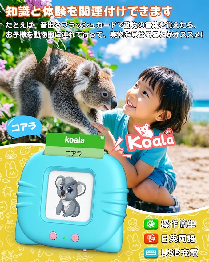 【幼児でも簡単に操作OK】インターネットに接続不要で、フラッシュカードを差し込むだけでネイティブの音声が流れてくるバイリンガル学習機です。発音が不安なところは、繰り返しボタンを押して確認ができます。また、ディスプレイを使わないため、子どもに画面を見せることに抵抗がある方や、視力の低下を心配する保護者にもおすすめです。USB充電式なのも嬉しいポイント。電池の交換を気にせずに遊ぶことができます。