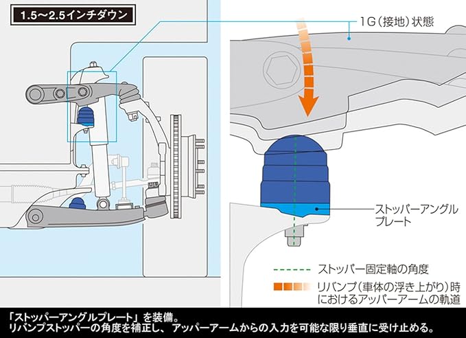 ハイエースをローダウンする際に邪魔な存在となる純正ストッパー。標準車高から大幅にダウンすることで、サスペンションの有効ストロークは極端に減少し、大きくバンプしたときに不快な衝撃を与えます。しかし、それを回避しようとストッパーを取り外した状態で走行すれば、段差やカーブなどでフロントタイヤがホイールハウスを激しく擦り、リバンプ時には反動で車体が浮き上がるなど、不安定で危険な状況にさえ陥ります。加えて、リア側で発生するアクスルキャリアとフロアの接触も重なり、まるで快適とはほど遠い乗り心地を強いられる結果となるのです。そんなローダウンの弊害を避けるために欠かせないアイテムが“ストロークストッパー"です。硬度の異なる合成樹脂を2層成形することにより、物理的に相反する衝撃吸収とストローク制御を高次元で両立。また、フロントバンプストッパーの作動ポイントを調整できる“アジャストプレート"を付属し、幅広いセットアップを可能にしました。
