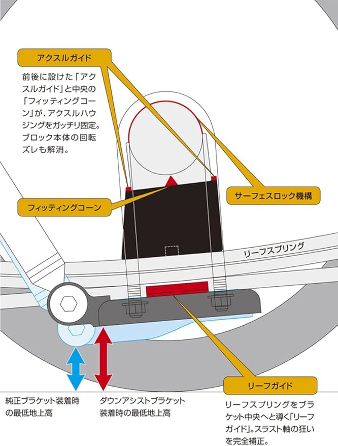 ハイエースをロ-ダウンする際に必要となるダウンブロックを多機能化することで、従来製品では補えなかった欠点を完全に克服しました。ブロック本体には、軽量かつ剛性に優れたA6061アルミ押出材を使用し、高精度の切削加工を施したのち、ショットブラストとブラックアルマイト処理で仕上げました。また、あらたな機能として、センターピンを円錐形状とした「フィッティングコーン」を採用。強烈な保持力を誇る“サーフェスロックUボルト"との組み合わせによる完璧なフィッティングを実現しました。さらに、前後方向のズレが原因で起こるアクスルハウジングの振れ(スラスト角)を抑制する「アクスルガイド」が、いかなる路面状況でも安定した直進性をサポートします。ほかにも、アクスルの角度を補正し、プロペラシャフトに掛かる負担を軽減する「アングルアジャスト機能」、オフセットしたアクスルを車体のセンターへ調整し、絶妙なツラ位置セッティングを可能にする「センタリング機能」、アクスルの前方移動を補正し、ホイールポジションをフェンダーアーチの中央へと矯正する「オフセンター補正機能」など、多彩なスペックを誇ります。ダウン量は0.5インチ(12.5ミリ)ごとに7種類のサイズを設定し、希望の車高へ確実にセットアップすることができます。