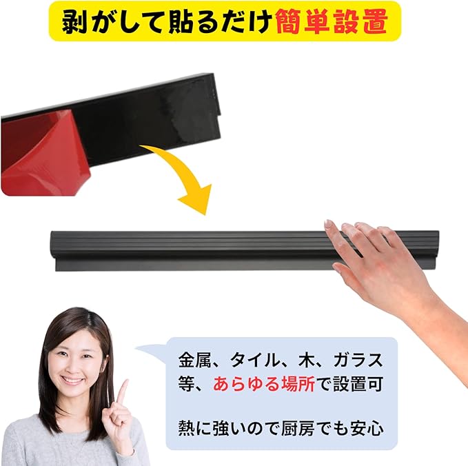 【穴あけ不要 壁を傷つけない伝票差し】強力粘着テープが付着されており、フィルムを剥がしてそのまま簡単設置できます。熱に強いタイプのテープなので、厨房でもはがれません。