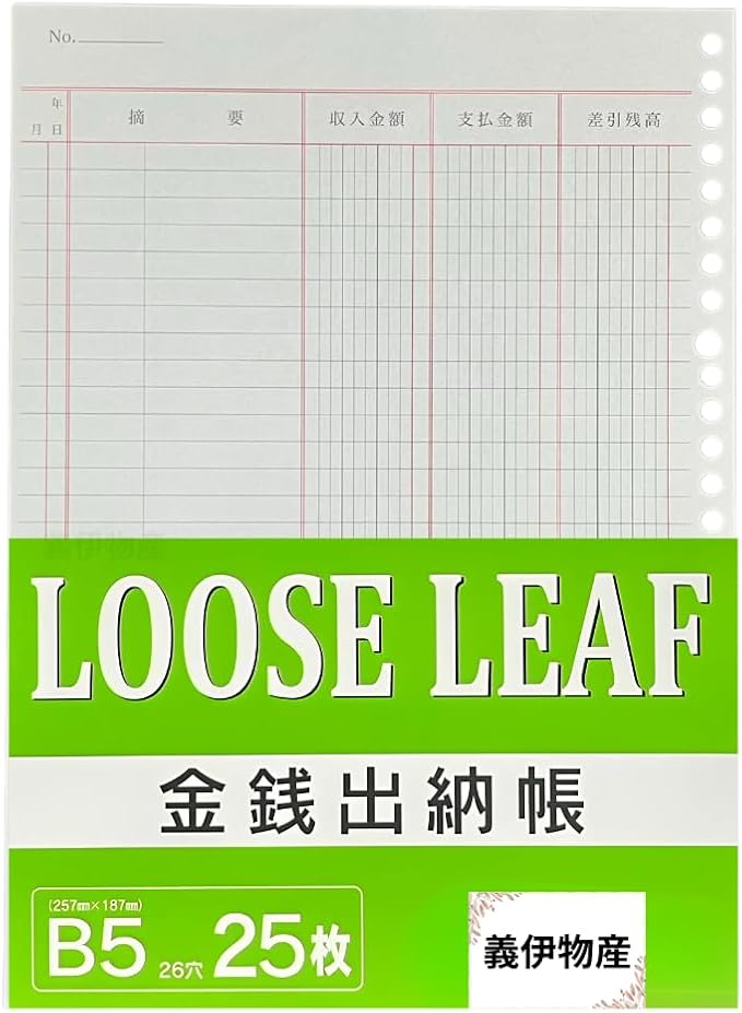 金銭出納帳 ルーズリーフ B5 25枚 26穴 LOOSE-LEAF 日本製 1個