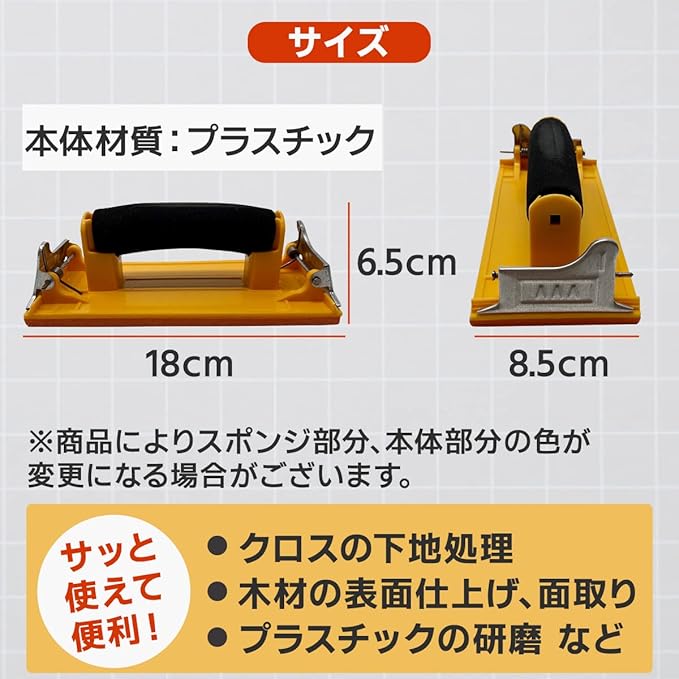 【商品内容】ハンドサンダー 【セット内容】サンドペーパーホルダー / 紙やすり3種(各種5枚セット)【カラー】イエロー 【サイズ】サンダー 底面:約18cm 約8.5cm 高さ:6.5cm /紙やすり 23cmx9cm 【素材】本体:プラスチック