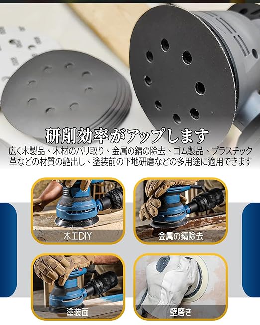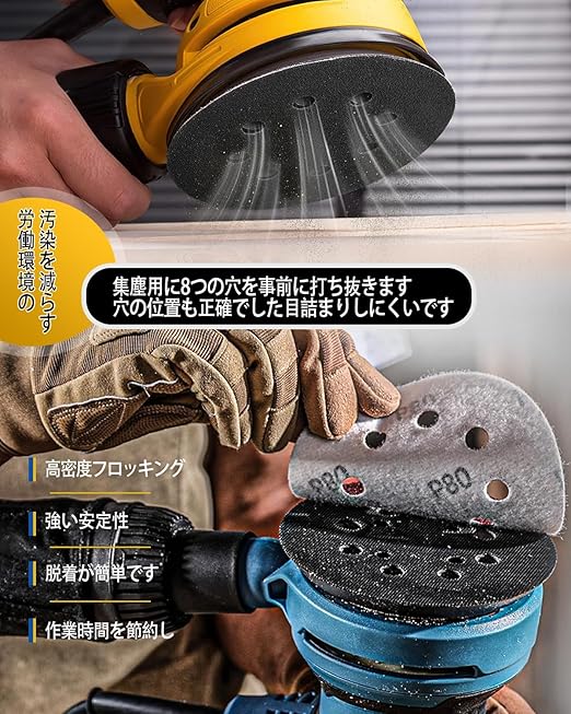 【使いやすいマジックテープ式】簡単に装着でき、強力な吸着力で外れにくい設計です。高速研磨時にも安定して耐久性を発揮し、作業時間を短縮します。集塵用に8つの穴を正確に打ち抜いており、目詰まりを軽減。さらに、1枚1枚に番手が裏面印刷されているので、識別が容易です。