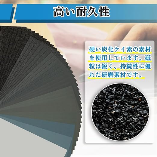 乾湿兼用 耐久性抜群:研磨シートで最新高品質の炭化ケイ素材を使用、硬度が高いで非常に丈夫にできています。耐水ペーパーで高い耐水性があるため、耐水なのでカスも出にくく、水研ぎにも強く使いやすいです。使用後に水洗するとかなりの回数使えます。