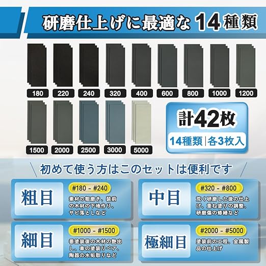 種類が豊富・14種42枚:180番目〜5000番目 紙やすり 耐水ペーパー セット、粗目・中目・細目・極細目セット、180 220 240 320 400 600 800 1000 1200 1500 2000 2500 3000 5000番号(各3枚)長さ230mm 幅93mm 紙ヤスリ。14種類が豊富で便利なセット! 42枚入っているので木工から塗装面の磨きまでなんでも使えそうです!