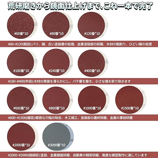 【サンドペーパー セット・粗目~極細目】#60/80/120/180/240/400/600/800/1000/1500/2000/3000各10枚合計120枚、サンダー ペーパー背面に数字が印刷されており、数字が小さいほど粗目、大きいほど細目です。75mm研磨パッド2個、75mmマジック パッド1個、6.3mm六角&6mm丸軸各1本、120 98 13mmスポンジヤスリ3枚
