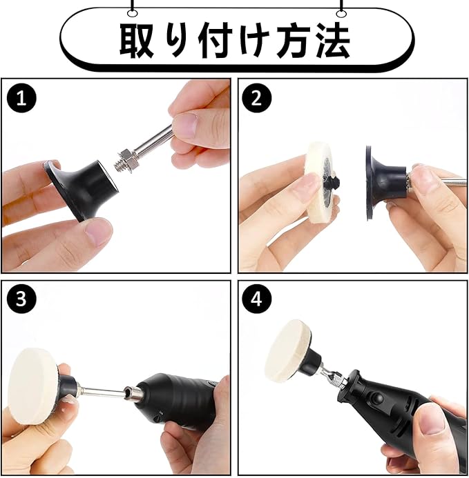 ポリッシャーバフセット: 40枚 フェルト バフ、1個 ディスクブラケット、1個金属六角軸、1個 金属丸シャフト,フェルトバフはユニークな安全トルクネジがあり、ツールで簡単に取り外すことができます