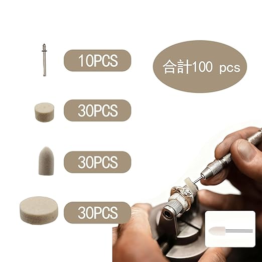ウールバフ ミニルーター ビット 100個入り - フェルト製 円筒/砲弾/尖頭型 電動ドリル/ポリッシャー対応 金属/ガラス研磨用 高輝度コンパウンド仕上げ 鏡面研磨用