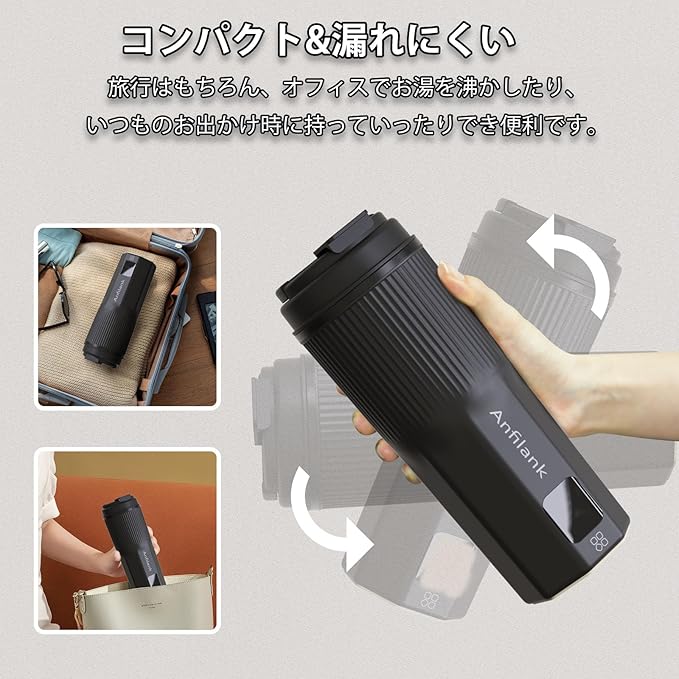 【日本海外兼用】 Anfilank ポータブル電気ケトル 380ml 6段階温度調節 12時間保温 持ち運びケトル トラベル湯沸かし器 三重安全保護 PSE認証済 (コンパクト/ステンレス二重構造/ 4分半沸騰/ 変換プラグ不要)ブラック