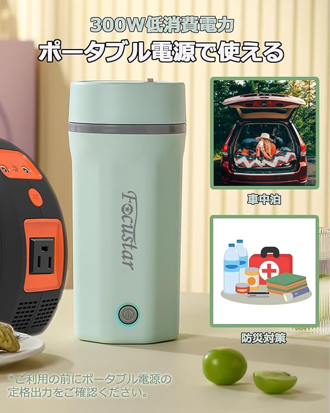 【300W低消費電力】このモバイルケトルはわずか300Wの低消費電力で動作し、ポータブル電源で使えるケトルです。アウトドアや車中泊に最適であり、非常時にも役立ちます。