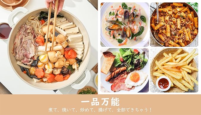 【IH対応/ガス対応・一品万能】IH、ガス火などオール熱源対応です。すき焼き、煮物、カレーなどのお馴染みの料理はもちろん、焼き餃子、焼きチキン、炒め物もこれ一品でOK!フライパンでできることはすべて、この鍋でもできて、本当に万能な一品です。