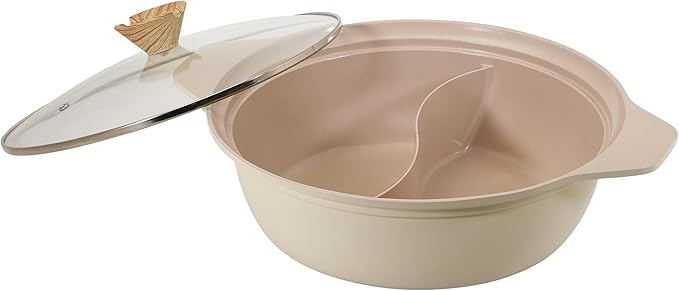 表面加工:内面/セラミック塗膜加工、外面/焼付け塗装、材料の種類:本体/アルミニウム合金、はり底/ステンレス鋼(クロム16%)、底の厚さ/4.5cm、蓋:品名/強化ガラス製器具、強化の種類/全面物理強化、その他の材料:縁リング/ステンレス鋼、つまみ/フェノール樹脂(耐熱温度150度)