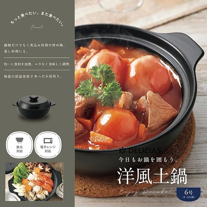 カクセー(Kakusee) 卓上鍋 19cm 1-2人用 6号 洋風 土鍋 陶器 電子レンジ対応 直火対応 デリシアス DEL-20