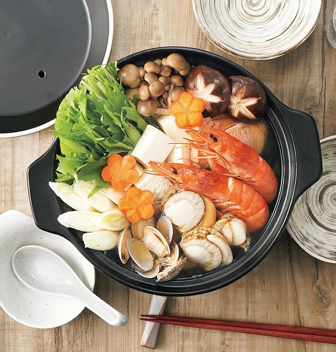 シックな洋風土鍋。鍋もの以外にも、煮込み料理や炒め物、蒸し料理にも。均一に食材を加熱し、ムラなく美味しく調理します。陶器の保温効果であったか長持ち!