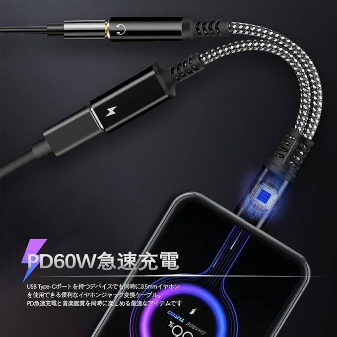 2IN1 ヤホンジャック 変換 typec イヤホン 変換 【2024】PD 60W急速充電 Hi-Fi音質 ナイロン編み ハイレゾ 持ち運びが簡単1Padpro/GooglePixel/Xperia/Samsung Galaxy 対応(ブラック 1個)