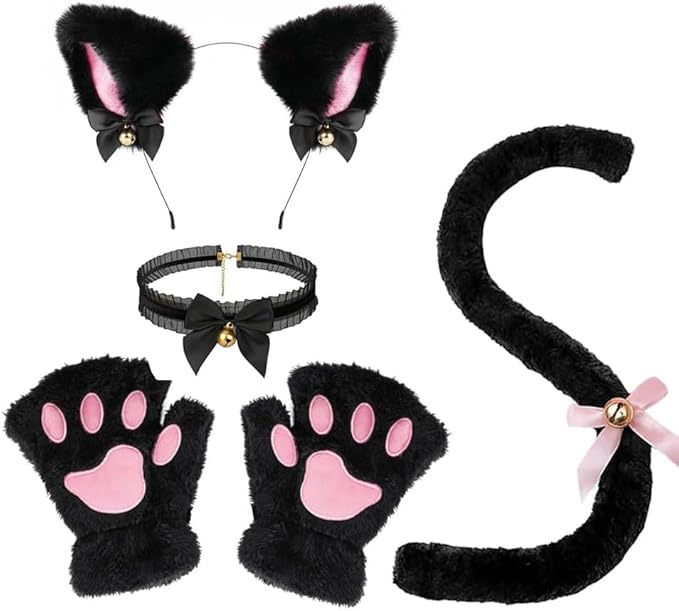猫耳 カチューシャ 肉球手袋 尻尾 チョーカー 鈴付き やわらかい ハロウィン コスプレ 小物 4点セット (ブラック)
