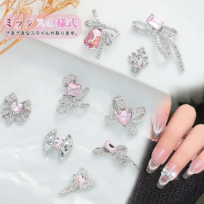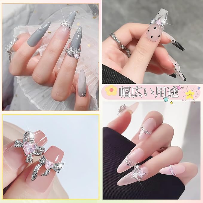 【商品情報】梱包内容:ネイルパーツ リボン20点入り。カラー:シルバー+ピンク。普段や結婚式などのパーティーに大活躍です