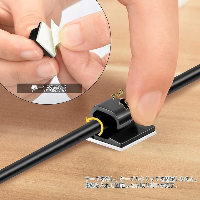 【使い方は簡単】固定したい場所に強力両面テープを剥がして貼り付け、ケーブルをクリップに挟むだけで配線が整理できます。釘は不要で、壁を傷つけません