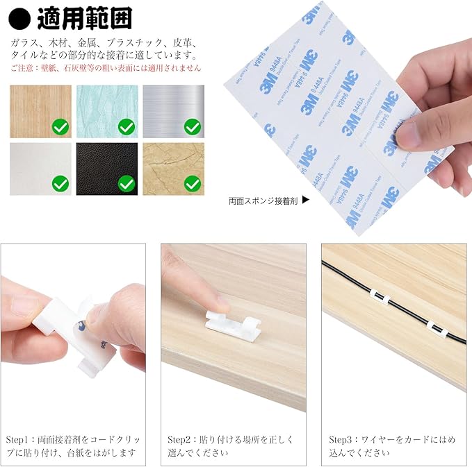 【使用簡単】最初のステップは、コードクリップの裏側に両面テープを貼り付けることです。次に、ワイヤーをコードクリップの内側にはめ込み、最後に正しい位置を選んで貼り付けます