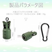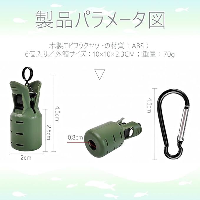 【製品仕様】フックカバー 6、カラビナ 7、シリコンバックル 1。フックカバーサイズ:45㎜ 20㎜ 。 【高品質な素材】このエギ針カバーは、固くても適度な弾力を持つ特別な素材でできています。長期間使用しても簡単に損傷することなく、フックを守ります。潮風や直射日光にさらされ続けても、ひび割れや変色が起こりにくい丈夫さで、何度使っても形が崩れません。 【携帯便利】収納や整理に便利なカラビナが付属しており、イカフック保護カバーをバッグに掛けて持ち運びが簡単です。釣りルアーフックカバーを屋外に持っていけます、バックルにより、バックパック、ベルトなどに取り付けることができます。 【使いやすい】イカジグフックカバーはワンクリックで開閉する仕組みを採用。スプリングバックルを搭載し、片手で簡単に操作可能。車で移動しながら釣りをする際、イカジグを付けたロッドをシートに置いても、フックがシートに刺さらず便利です。 【幅広い適用範囲】すべてのタイプとサイズのイカジグに対応。釣り愛好者なら誰もが持つべき必須ツールです。