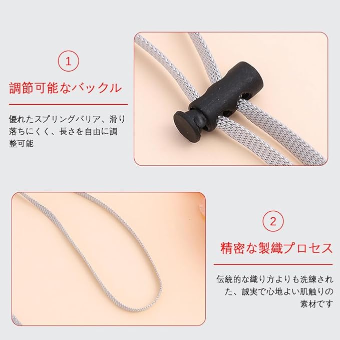 【 調節可能 】: 調節ボタン付き、紐の長さが自由に調整でき、邪魔になりません。