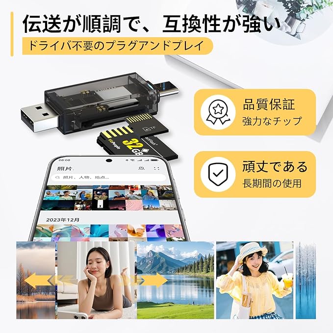 【プラグアンドプレイ機能でドライバーインストール不要】複雑な設定は一切不要です。お使いの対応デバイスに本製品を差し込むだけで、自動的に認識し、すぐに使用を開始できます。専門的な知識がなくても、誰でも簡単かつ安全にデータのバックアップ、転送、閲覧が行える、非常にユーザーフレンドリーな設計です。