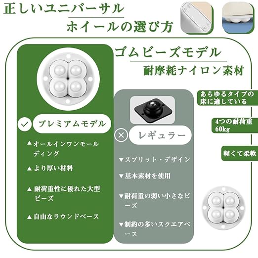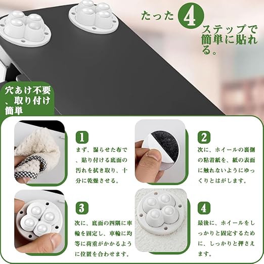 【使用方法】1まず、湿らせた布で、貼り付ける底面の汚れを拭き取り、十分に乾燥させる。2次に、ホイールの裏側の粘着紙を、紙の表面に触れないようにゆっくりとはがします。3次に、底面の四隅に車輪を固定し、車輪に均等に荷重がかかるように位置を合わせます。4最後に、ホイールをしっかりと固定するために、しっかりと押さえます。