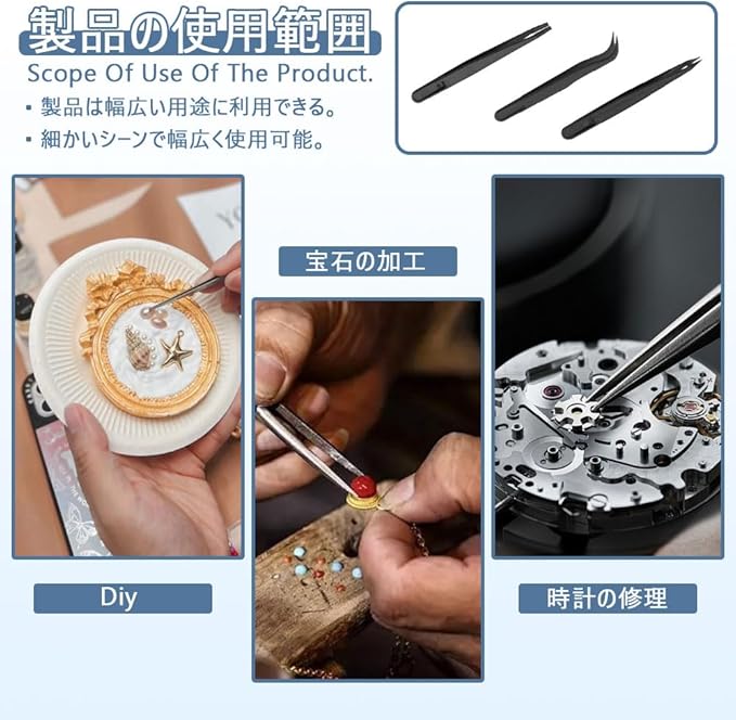 【適用範囲】 DIY 制作(ビーズアクセサリー・樹脂工作)、宝石加工(宝石のカット・セッティング)、時計修理(内部機構の組み立て・調整)、日常小物修理(細かい部品交換)など。細かいパーツを扱う作業ならどこでも活躍します。