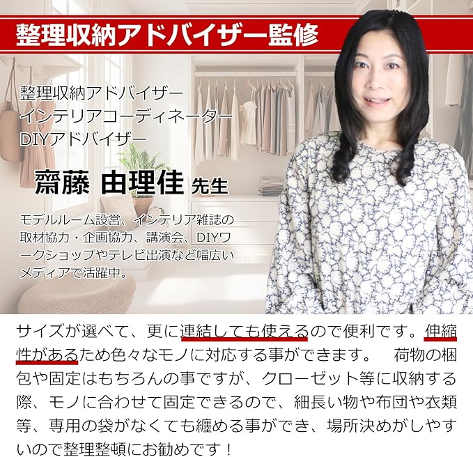 【用途は様々! 】 連結することで小さな荷物から大きい荷物まで様々な用途で活躍します。 ✔ 引っ越しの際にかさばる小物の荷造り、アウトドアへ行く際に持ち運ぶの面倒なレジャーシートやテントなどの固定、非常時・災害時用の荷物などもしっかりと固定していざという時にすぐに持ち出すのに便利。 ✔ 車やバイクに積む荷物の固定はもちろんのこと、ベビーカーや自転車など車内では動いてしまい不安定な物の固定など、様々なシーンで大活躍します。✔ 使い方はあなたのアイデア次第でどんどん広がります!
