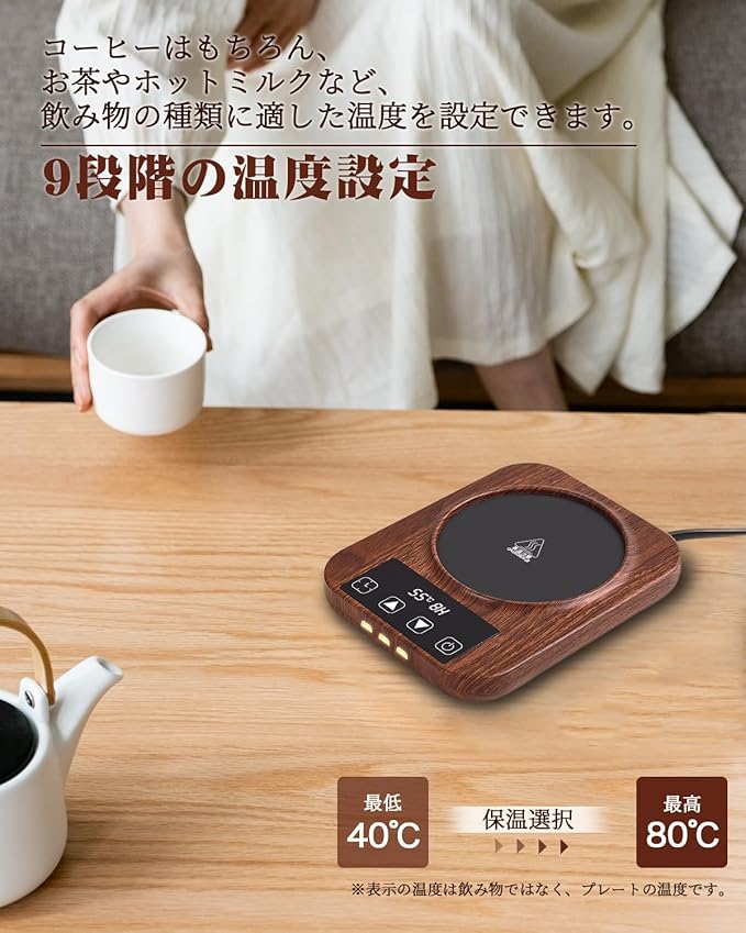 【最後までアツアツ】 カップウォーマー コーヒーウォーマー ドリンクウォーマー 9段階温度調節 切タイマー 予約機能 保温コースター コーヒーカップウォーマー メモリー機能 最大80℃ マグカップ ウォーマー オフィス 職場 デスク 卓上 プレゼント ギフト 木目