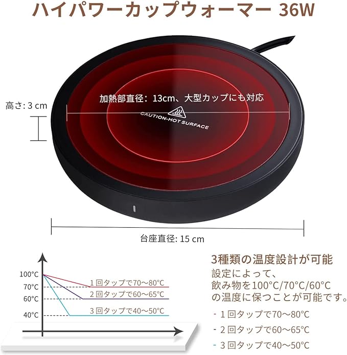 【広い加熱面積】目立ちすぎない黒いガラス面は、大きなカップやマグカップ用に対応できるよう設計されています。加熱面積13cmは、ほとんどのコーヒーカップに対応する大きさです。36Wの電力は、過度の放熱を避けながらも、大きなカップに適しています。防滴仕様となっており、お手入れも簡単です。PTCヒーターは、マグカップの温度を一定に保ち、消費電力も少ないのが特徴。ヒーターチューブと異なり、加熱しても赤くならないので、安全で耐久性に優れています。