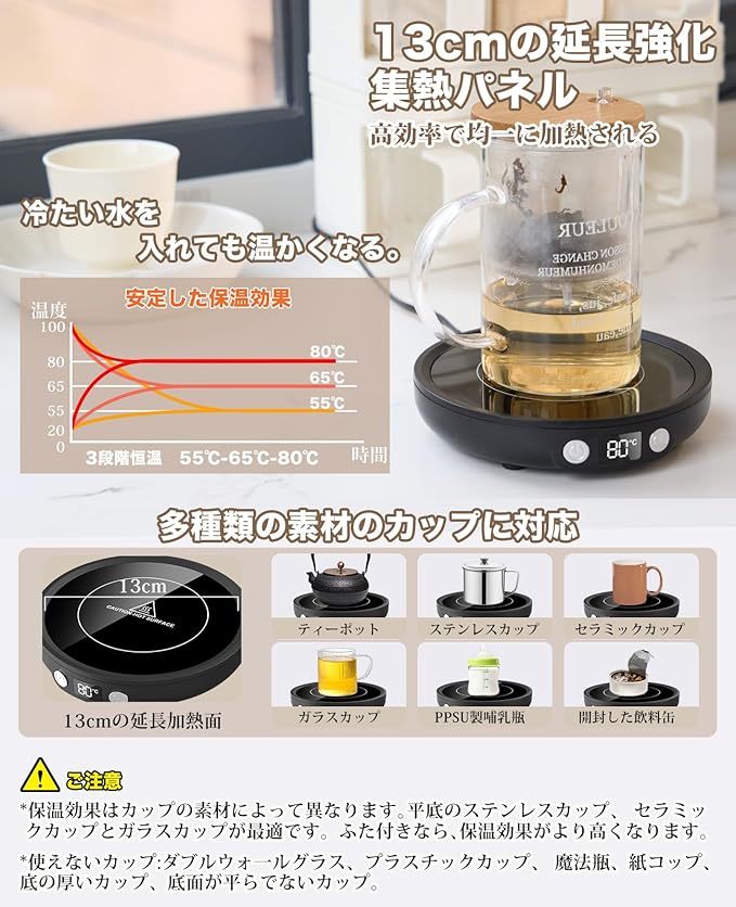 【13cmの延長強化集熱パネル/3段階恒温調節/最大80℃】こ目立ちすぎない直径13cmの黒いガラス面の保温コースターは、大きなカップやマグカップ用に対応できるよう設計されてほとんどのコーヒーカップに対応する大きさです。熱抵抗が小さく、伝熱効率が高いPTCヒーターを搭載し、3段階調節自動恒温55-65-80℃を組み合わせてマグカップの温度を一定に保ち、より均一に安定した保温効果をに達します。PTCヒーターは、ヒーターチューブと異なり、加熱しても赤くならないので、安全で耐久性に優れています。 陶器製のカップはもちろん、ステンレス、ガラス、ミルクパックなどにもお使いいただけます。 ご注意 : ①保温効果はカップの素材によって異なります。平底のステンレスカップ、 セラミックカップとガラスカップが最適です。ふた付きなら、保温効果がより高くなります。 ②使えないカップ:ダブルウォ一ルグラス、プラスチックカップ、 魔法瓶、紙コップ、底の厚いカップ、底面が平らでないカップ。
