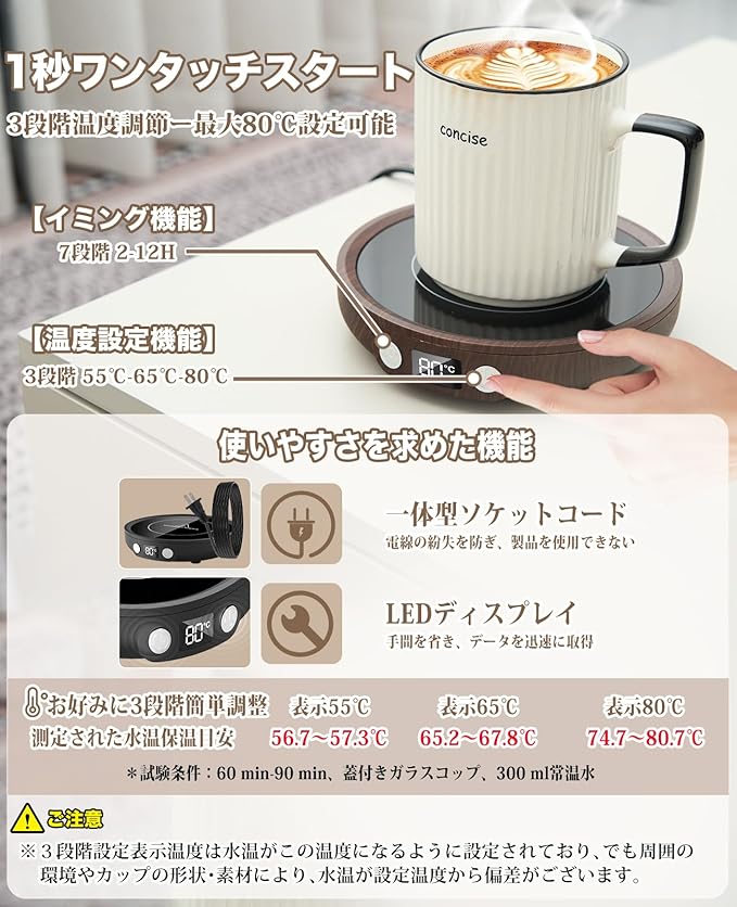 【2種類のPSE安全認証取得済み/精巧な外観デザイン/ギフトに最適】当店のカップウォーマーは2種類のPSEマーク付いています。障害の発生による消費者への危険が防止され、安全使用が保証されます。和風デザイン 独特の木目色調/黒色色調-ご家族やご友人へのプレゼントに最適です。誕生日、バレンタインデー、クリスマス、敬老の日、母の日、父の日、年寄り、その他の特別な日にはオフィスや自宅で使用し、時間が経ってもホットドリンクが熱々のまま保たれるため、最後のひと口まで美味しく飲めるというワケです。 製品情報 ①サイズ:W150*D150*H31mm 約399g ②定格電力:36W AC100V 50/60Hz ③2プラグソケット: 1.55m④3段階恒温調整:80-65-55℃⑤7段階タイマー設定:2H、3H、4H、6H、8H、10H、12H
