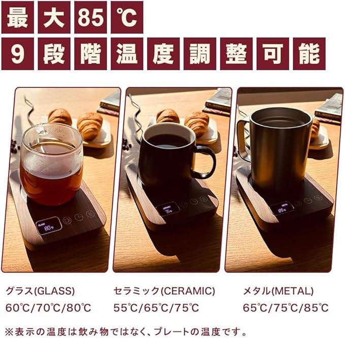 【お好みの加熱温度に調整できる】使用するカップの熱伝導率に合わせて、加熱温度を55℃から85℃までに細かく調整できます。これで寒い冬でも飲み物を温かいまま楽しめます。カップウオ一マ一の作動中、設定した温度は常にデジタルで表示されような仕様になっており、いつでも加熱温度を確認できます。(表示温度は飲み物の温度ではなく、加熱プレートの目安温度になります。ご使用いただいたカップの材質により、飲み物の温度は影響されます。また、より良い保温効果を得るには、底が平らなフタ付きのカップを使用することをお勧めいたします。)