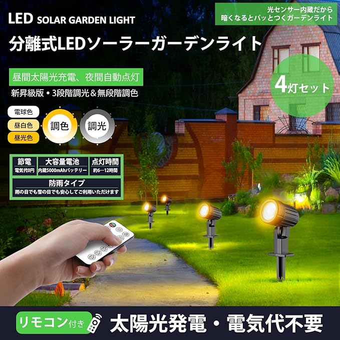 ☀►☄【光センサー機能付き・自動点灯/消灯&省エネ・電気代不要】庭の飾りや日常照明づくりの道具として毎日使うなら、基本的には明暗センサー搭載のものを選ぶとよいです。このライトは明暗センサーがあり、電源が入っている状態ですと昼には、光感センサーが昼の光を感応して、自動的に充電状態になって、点灯しません。夜になると、周りが暗くなると、3点のスポットライトが自動点灯できます。5000mAhの大容量の電池を搭載、ソーラーパネルが日中太陽光で約10時間フル充電し、約6-12時間を点灯できます(充電時間と照明時間が天気によって変わっています)。太陽光発電だから電気代不要でコードレスです。