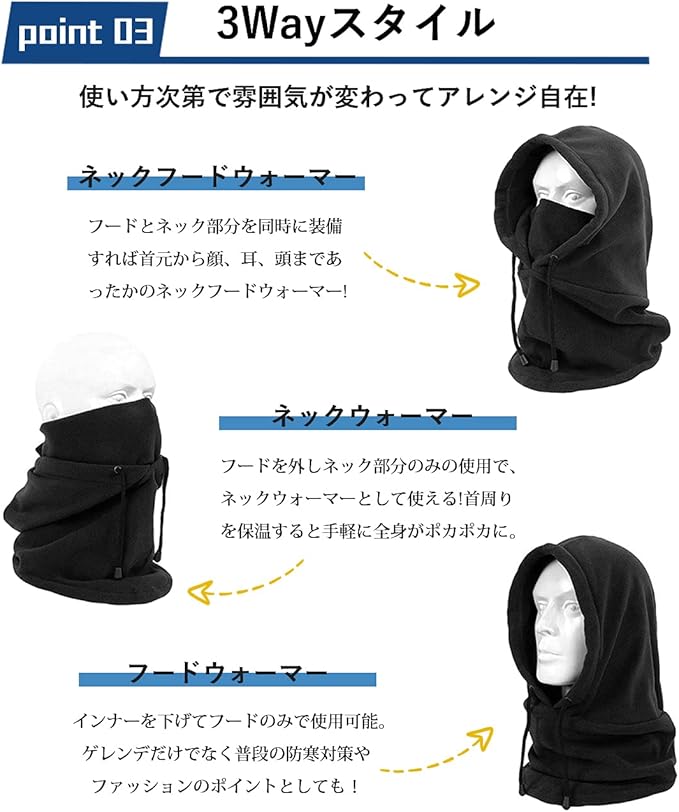 [Bafup] ネックウォーマー 帽子 ネックカバー 3Way・高機能断熱フリース素材・360度保温防風・息苦しくない 目出し帽 冬 フードウォーマー 3Way 首長タイプ アウトドア・スポーツ・スキー・バイク・自転車・通勤・通学・男女兼用
