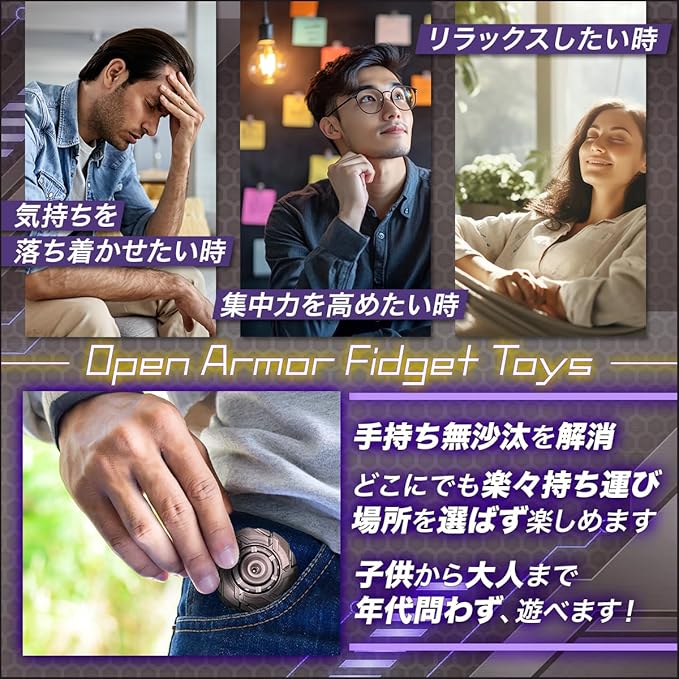 ストレスを和らげ、集中力もサポート このフィジェットトイは、ストレス発散に最適なアイテムです。回転させることで心地よい金属音と触覚フィードバックを得られ、不安やイライラを自然に和らげます。爪噛みや喫煙などの悪習慣の置き換えにも効果的で、集中力アップや思考の整理にも役立ちます。手持ち無沙汰な時間を、有意義なリラックスタイムに変えてくれるサポートアイテムです。