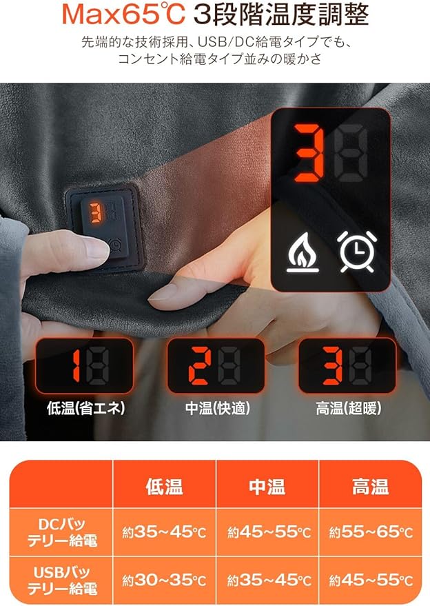 【USB+DC・2WAY給電で急速発熱・丸洗いOK】充電式ではなく、電源を取りながら使用する電気ブランケットです。USBとDC端子の2WAY給電方式を採用し、USB(普通)モードでは約40℃の穏やかな保温と長時間持続が可能で、DC(極寒)モードでは最大65℃まで急速昇温が実現、寒さの厳しい環境でも素早く体を温められ、ダニ対策にも効果的。手洗いも洗濯機での丸洗いも可能なので、いつでも清潔を保てます。洗濯機で洗う際、洗濯ネットを使ってください。(※乾燥機や洗濯機の乾燥機能は使用しないでください。)