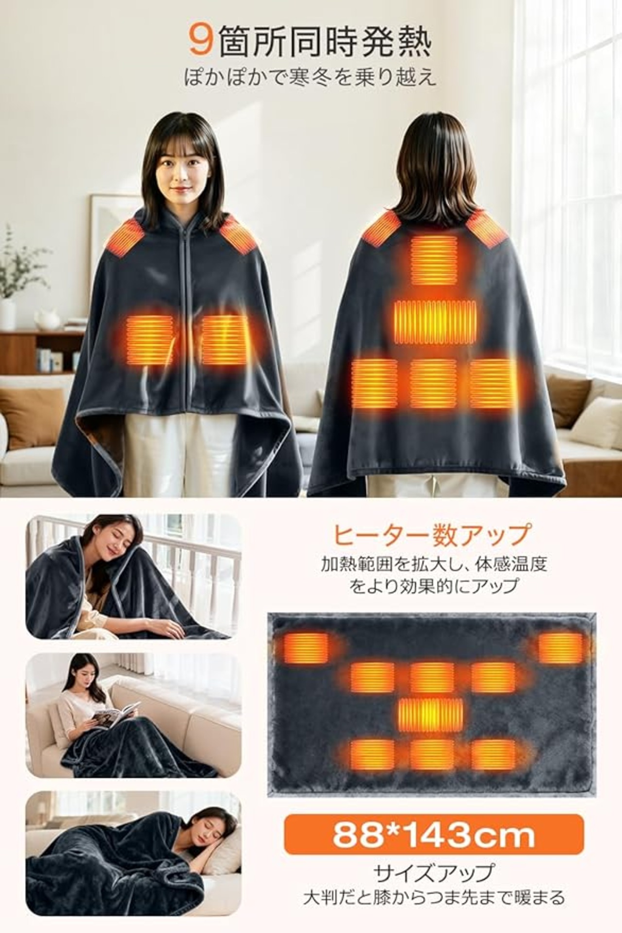 電気毛布 掛け 敷き 兼用 【2025新モデル 143 88cm大判サイズ・9箇所発熱】 電気ブランケット MAX65℃ 速暖 3段階温度調節 USB/DC給電 電気ひざ掛け 肩掛け 腰巻き 敷毛布 丸洗い可 6Hタイマー付き 切り忘れ防止 ダニ退治 日本製ヒーター 防寒対策 暖房器具 ふわふわ ブランケット 省エネ キャンプ 車中泊 テント泊 アウトドア オフィス (灰色 本体のみ)