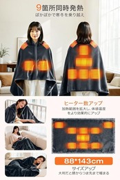 【9点発熱で体を暖かく包む多用途ブランケット・電気毛布のみ】9ヶ所に配置された発熱体が、バッテリー(別売)などに接続することで均一に発熱し、暖かさを届けます。143 88cmの大きいサイズで、膝掛けはもちろん、肩掛けや腰巻き、敷き毛布としても活用可能。軽量で携帯性に優れ、自宅、オフィスの屋内使用から、車中泊やキャンプ、屋外イベントなどのアウトドアシーンまで大活躍。寒さが気になる季節にぴったりで、夏場の冷房対策や防災用品としても一年中活用できる頼もしい防寒アイテムです。