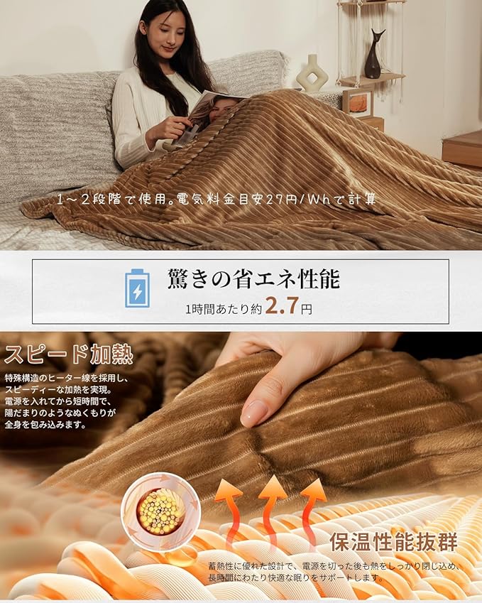 【188 130cmのサイズで包まれる、もっちりふわふわの極上感触、もこもこ電気掛け敷き毛布】 長毛を立たせる特殊加工により、ふんわりながらもボリューム感のある肌触りを実現。身体を包み込むと離したくない、心地よい温もりが続きます。単なる毛布や電気ひざ掛けとしてだけでなく、電気敷毛布として、あるいはベストやスカート、ポンチョのように身にまとって──多彩なスタイルで、優しい温かさとともにあるくつろぎの時間をお届けします。乾燥しがちな冬場もご安心を。静電気防止加工によりパチパチ感を抑制し、ホコリの付着も軽減。洗濯機での丸洗いにも対応しているため、清潔を保ちながら長くお使いいただけます。省エネ性能も優秀:弱運転時(電力単価27円/kWh計算)の1時間あたりの消費電力は約2.7円、家計に優しい設計です