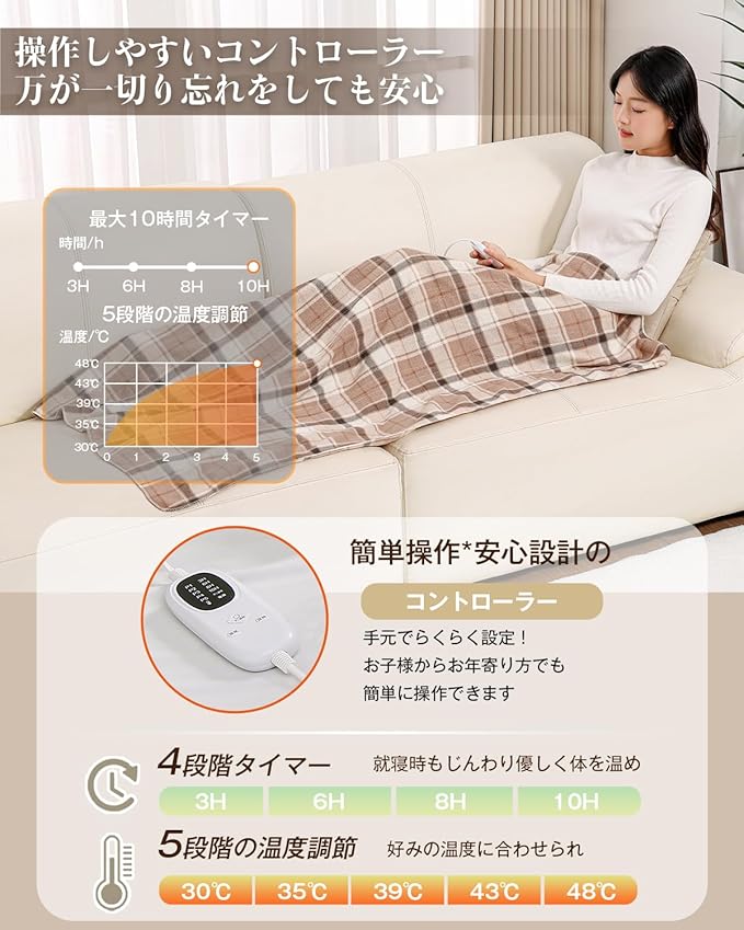 【5段階温度調整・切り忘れ防止タイマー付き】電気毛布はコントローラー付き、ボタンを押すだけの簡単操作で、温度とタイマーの時間を細かく設定することができます。30℃、35℃、39℃、43℃、48℃の5段階で温度調節が可能で、家族全員が快適に使用できます。また、3時間、6時間、8時間、10時間に設定可能なオフタイマーを備えており、就寝時などに便利です。タイマーが設定しない場合、3時間後自動に電源が切れ、付けっぱなしを防止可能。低温やけどや消し忘れによる事故を防ぎ、省エネにも貢献し、切り忘れの心配も軽減できるため、高齢者の方も安心して使用できます。