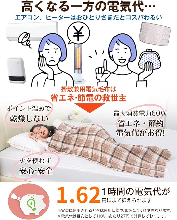 【60Wで速暖・電気代節約】電気毛布の最大消費電力はか60Wで、強モードで使用した場合、1時間あたりわずか1.62円の省エネ設計。エアコンやヒーターを長時間つけるよりも電気代を大幅に節約できるのに、温もりは想像以上。毎日の光熱費を気にする冬でも、「快適さ」と「節約」を同時に叶えてくれる、まさに時代が求めた次世代型の電気毛布です。頭寒足熱を基本に細かな配慮をした配線設計で、冷えやすい足元はしっかり、胸元はソフトに暖め心地よい眠りを実現します。寒い夜でも快適に過ごせます。